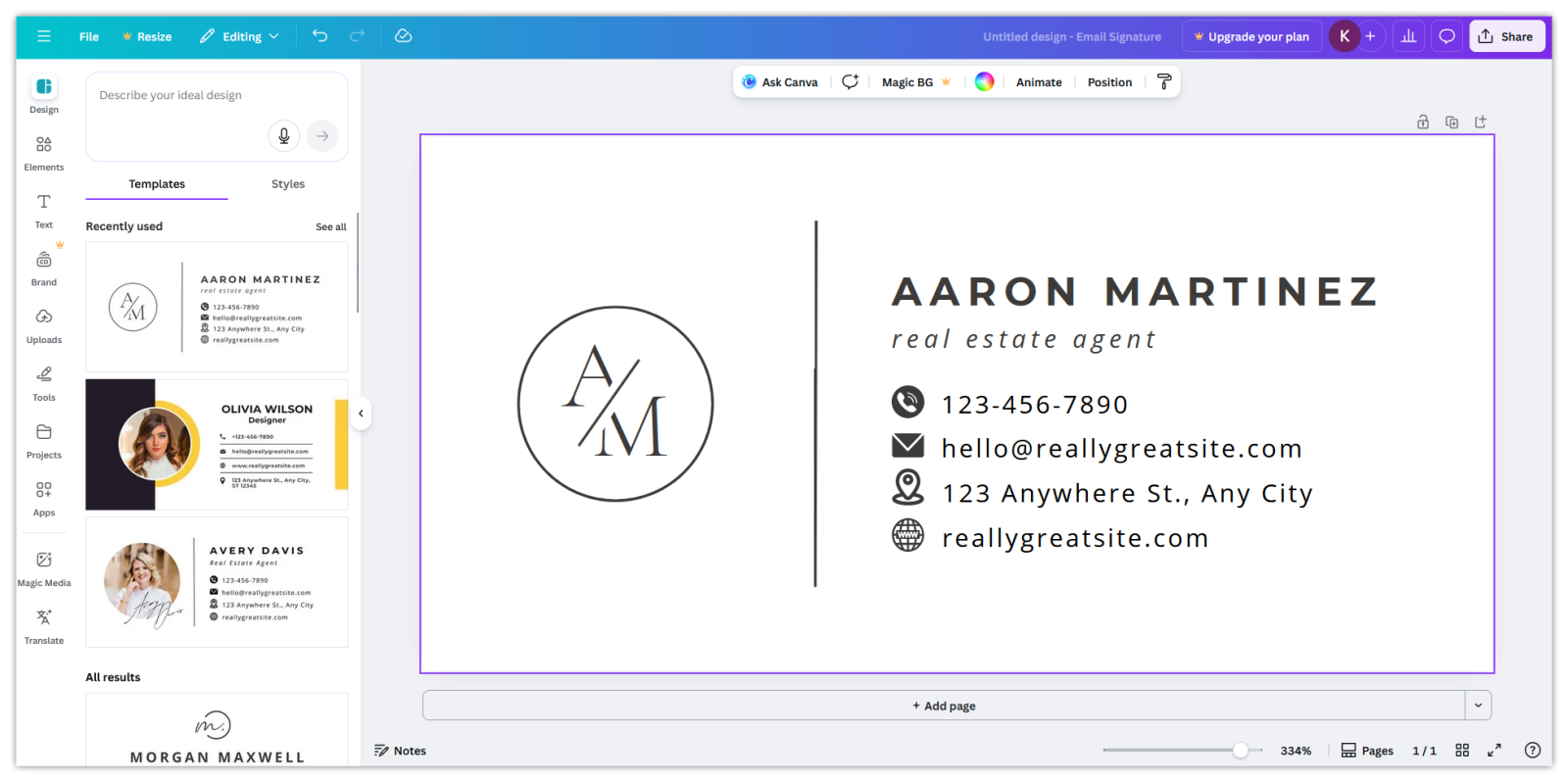 canvaIf you’ve ever touched Canva, you know what to expect: lots of templates, lots of design freedom, and a feeling that you’re decorating more than building. Canva’s email signature templates look nice at first glance, almost like mini branding boards. The downside is that most of them are basically images, which can be blocked by email clients, nothing can be clicked (no links), etc.  And full-image signatures don’t play well with email clients.