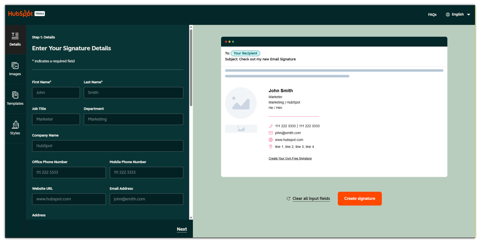 hubspotHubSpot’s free generator is one of the first tools people try because… well, it’s HubSpot. The tool gives a handful of decent templates and lets you add your details fast. But it’s simple by design. You can’t do custom layouts, and you don’t get cloud storage.