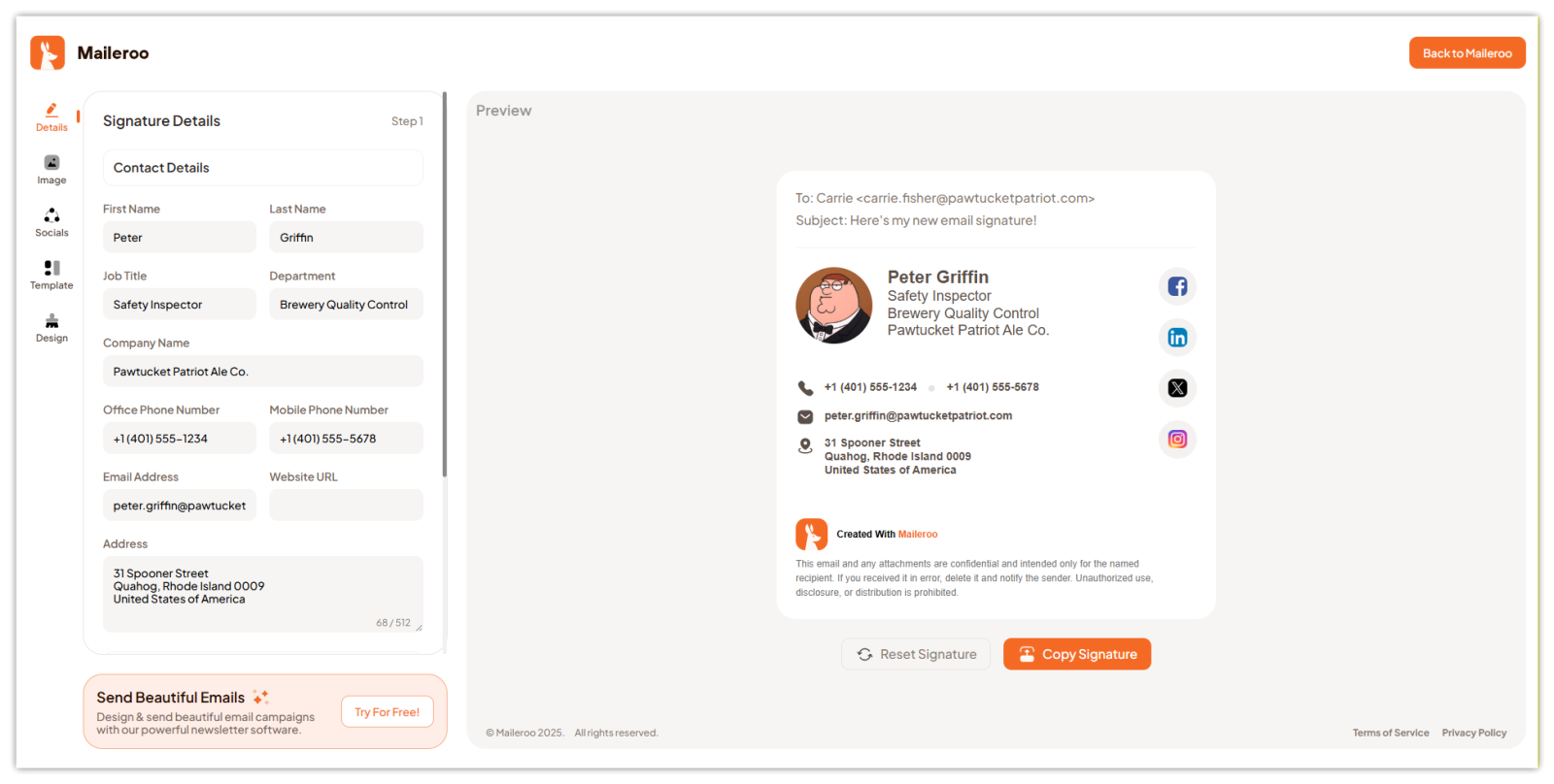 mailerooMaileroo likes to position itself as a simple, accessible generator. It offers a straightforward editor with a few template choices, image support, and simple social icons. It’s quick. It’s easy. And if all you need is something clean you can paste into Gmail, it ticks the box.