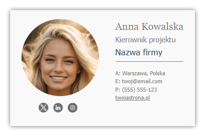 Uwzględnij tylko niezbędne informacje: imię i nazwisko, stanowisko, firmę, telefon i stronę internetową.